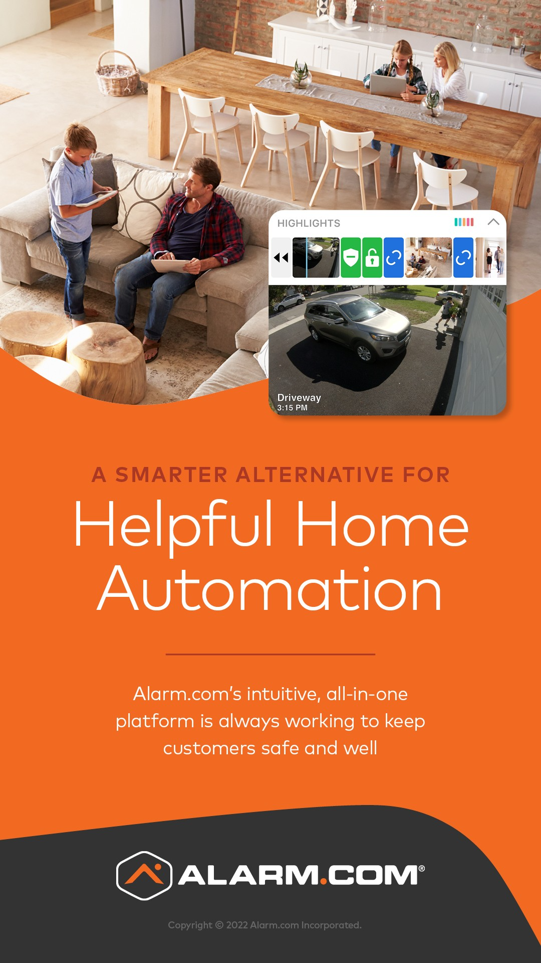 Alarm.com is the leading platform for the intelligently connected property. Millions of consumers and businesses depend on Alarm.com's technology to manage and control their property from anywhere. Our platform integrates with a growing variety of Internet of Things (IoT) devices through our apps and interfaces. Our security, video, access control, intelligent automation, energy management, and wellness solutions are available through our network of thousands of professional service providers in North America and around the globe. Alarm.com’s common stock is traded on Nasdaq under the ticker symbol ALRM.